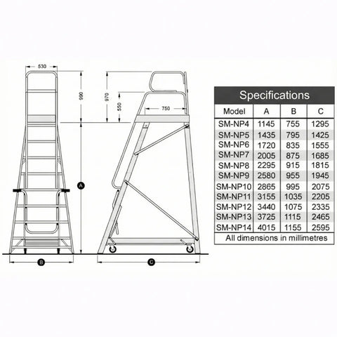| Platform Height (mm) | Model Code | Unit Weight (kg) | Working Range – 0-5kg Item (m) | Working Range – 5-20kg Item (m) |