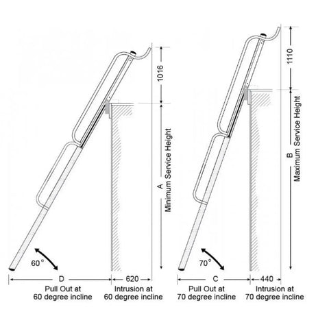 As the ladder angle changes within the 60–70° range, the amount it projects into the room and the height above the mezzanine in the stored position will also vary slightly.