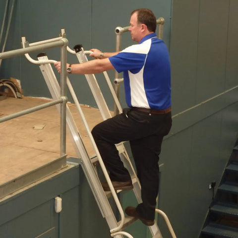 The Stockmaster Mezzalad is a mezzanine ladder with handrails designed for workplaces that need safe, repeatable access to upper levels without sacrificing valuable floor space. When it’s not in use, Mezzalad stores flat against the wall, then swings into position with a simple lift and pull action, so it’s always there when you need it and out of the way when you don’t.