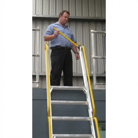 A safety gate is provided at the upper floor level to maintain the integrity of the perimeter railing. Importantly, the gate can be opened or closed with the operator standing fully on the upper floor, which removes the risks associated with operating a gate while standing on the ladder.